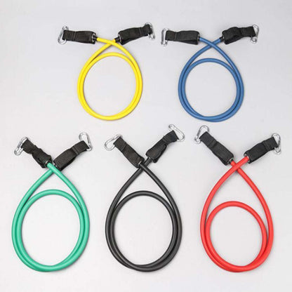 - Stackable bands for adjustable resistance levels. Comes as a set of 5; 48-inch long colored exercise bands. Yellow; Red; Green; Black; and Blue bands can also be combined together to provide up to 120 lbs of resistance. The metal clip system allows you to attach the included soft-grip handles or ankle straps for a more comfortable workout.