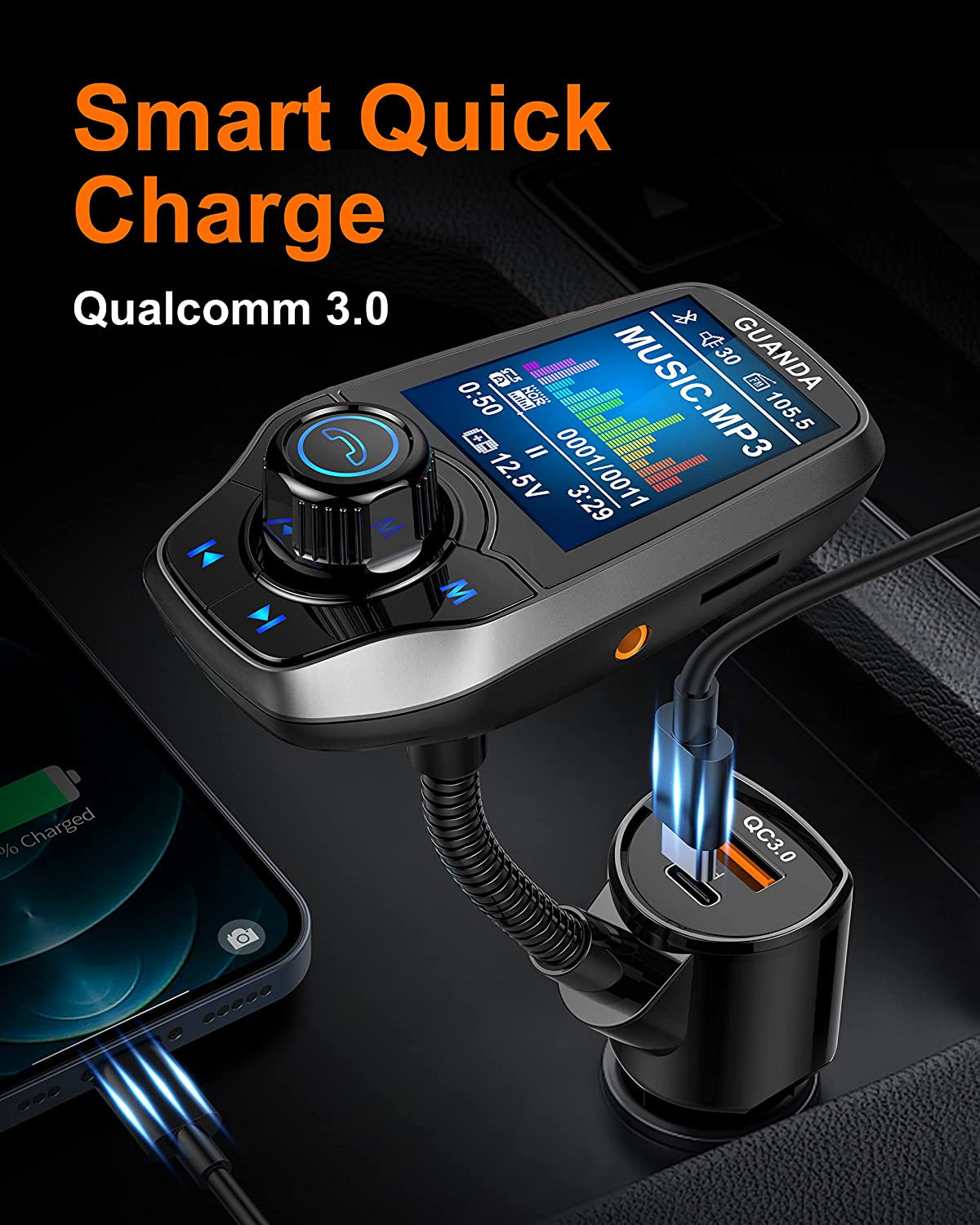 INTELLIGENT CAR CHARGER ADAPTER; SAFE AND QUICK CHARGE: FM transmitter for car comes with 2 USB ports (PD 20W and QC3.0); you can charge two devices simultaneously. Built-in over-current protection; over-voltage protection; intelligent temperature control; short circuit protection; it will effectively ensure safe charging.