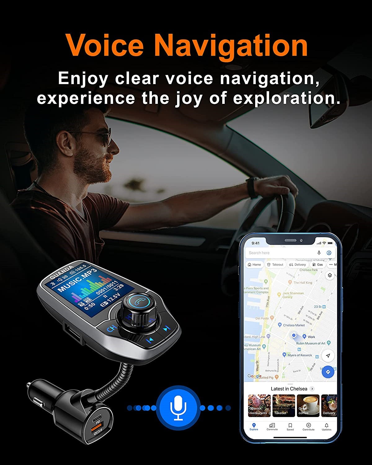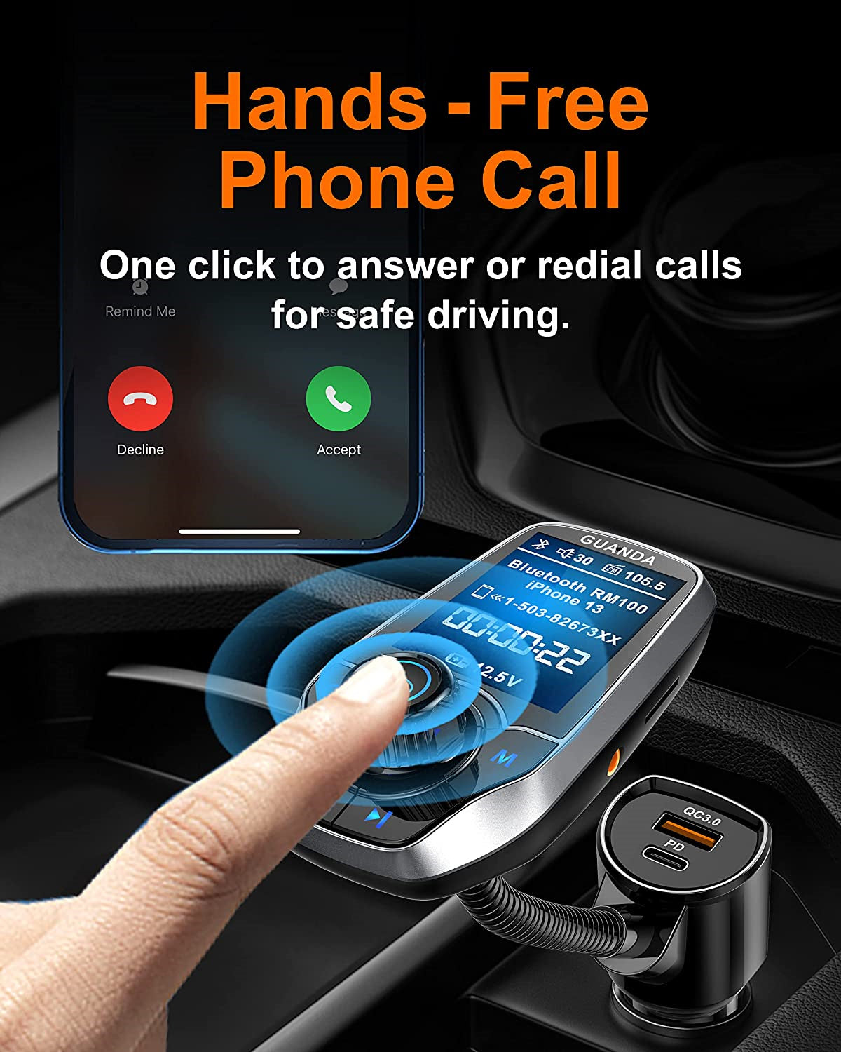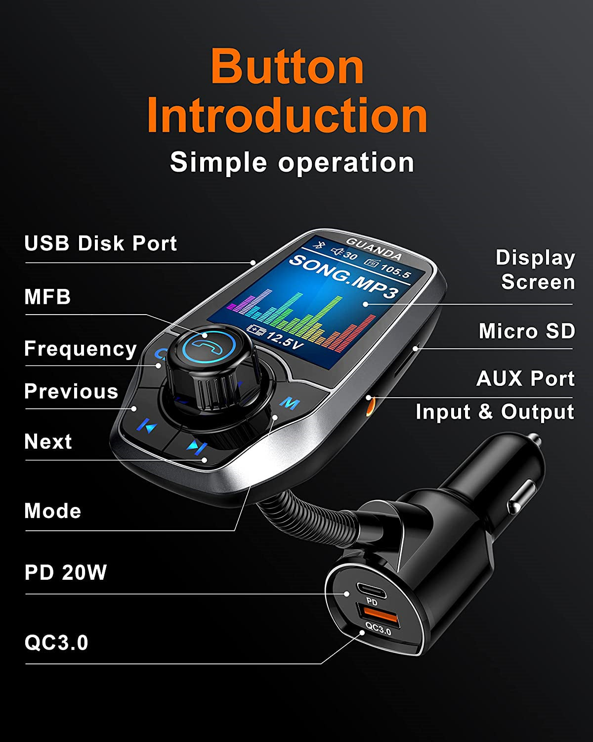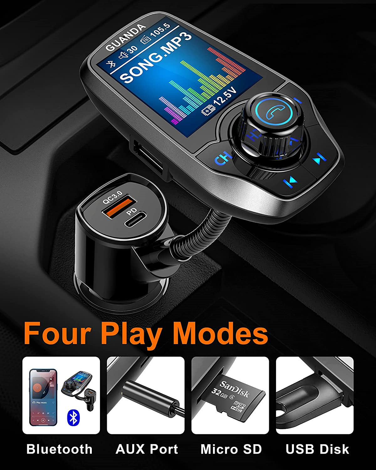 EXCELLENT 4-in-1 BLUETOOTH FM TRANSMITTER: Guanda’s Bluetooth car adapter can accept UNIQUE 4 different audio transmission ways: Bluetooth; U Disk; AUX input/output Port; TF Card. Our Car Radio Adapter Bluetooth FM Transmitter has Broad compatibility with Samsung; LG; Sony; iPhone (including X; XS; 11/12/13/14 Pro Max); Android; iPad; and more.