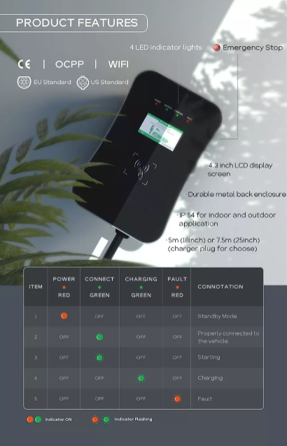 Key surface indicator: green / blue / red (blue-standby; green-charging gun connected to the car, flashing for charging; red-abnormal)