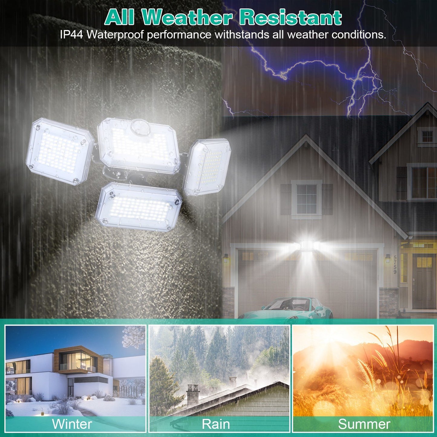 *IP44 Waterproof Security Lights*:Made of upgraded ABS,the outdoor solar lights are IP44 waterproof,not afraid of outdoor dust and rain. Specifically designed to withstand extreme weather conditions,all weather resistant and provide additional safety and security for your home.