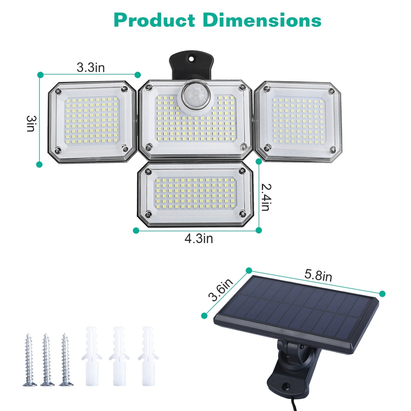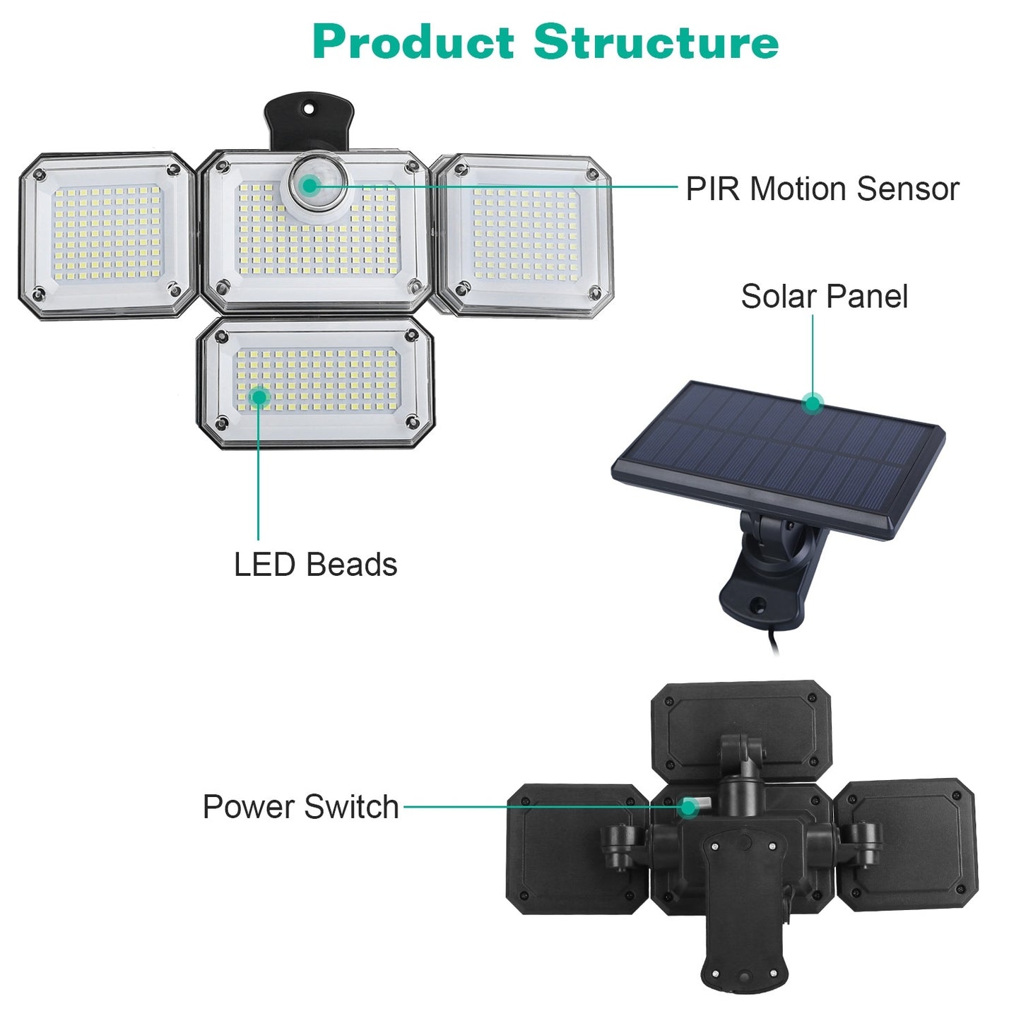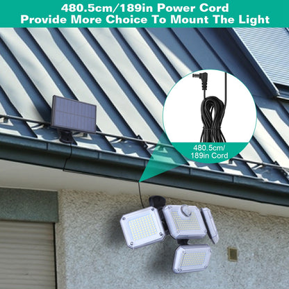 *4 Adjustable Heads & Separate Solar Panel*:The 4 adjustable heads can move up,down or horizontally,which allows you to light any angle you want. The solar panel can be adjusted at will to ensure that each angle can absorb sunlight to the maximum extent. Moreover,the separate panel is equipped with 189in long cable,which enables you to install it at different angles. The sensing angle of up to 120° and the sensing distance of 118in can provide additional brightness and a larger visible area.
