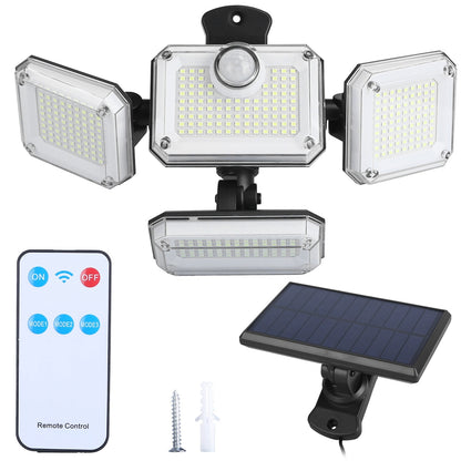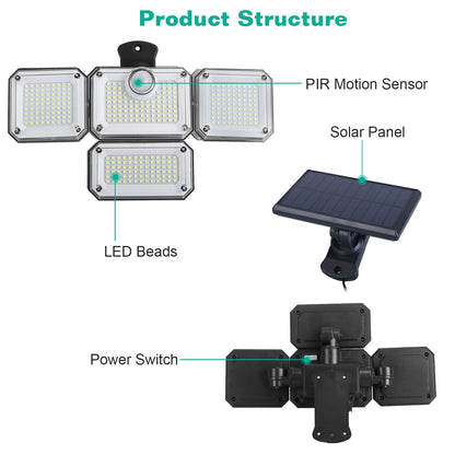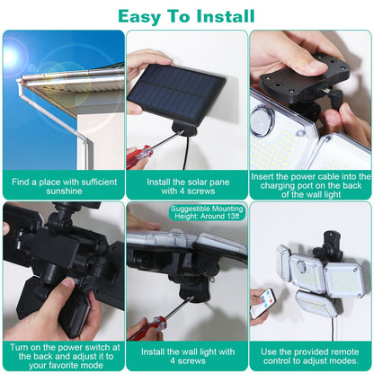 Solar Powered Wall Lights Outdoor Motion Sensor Lamps with Separate Solar Panel 4 Adjustable Heads 333Pcs Beads 120° Sensing Angle Remote Control Waterproof Lights for Yard Front Door Porch Garage