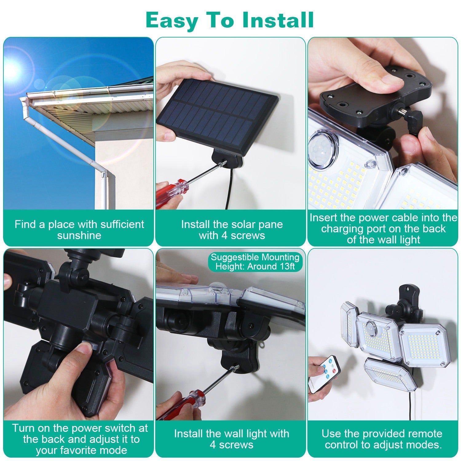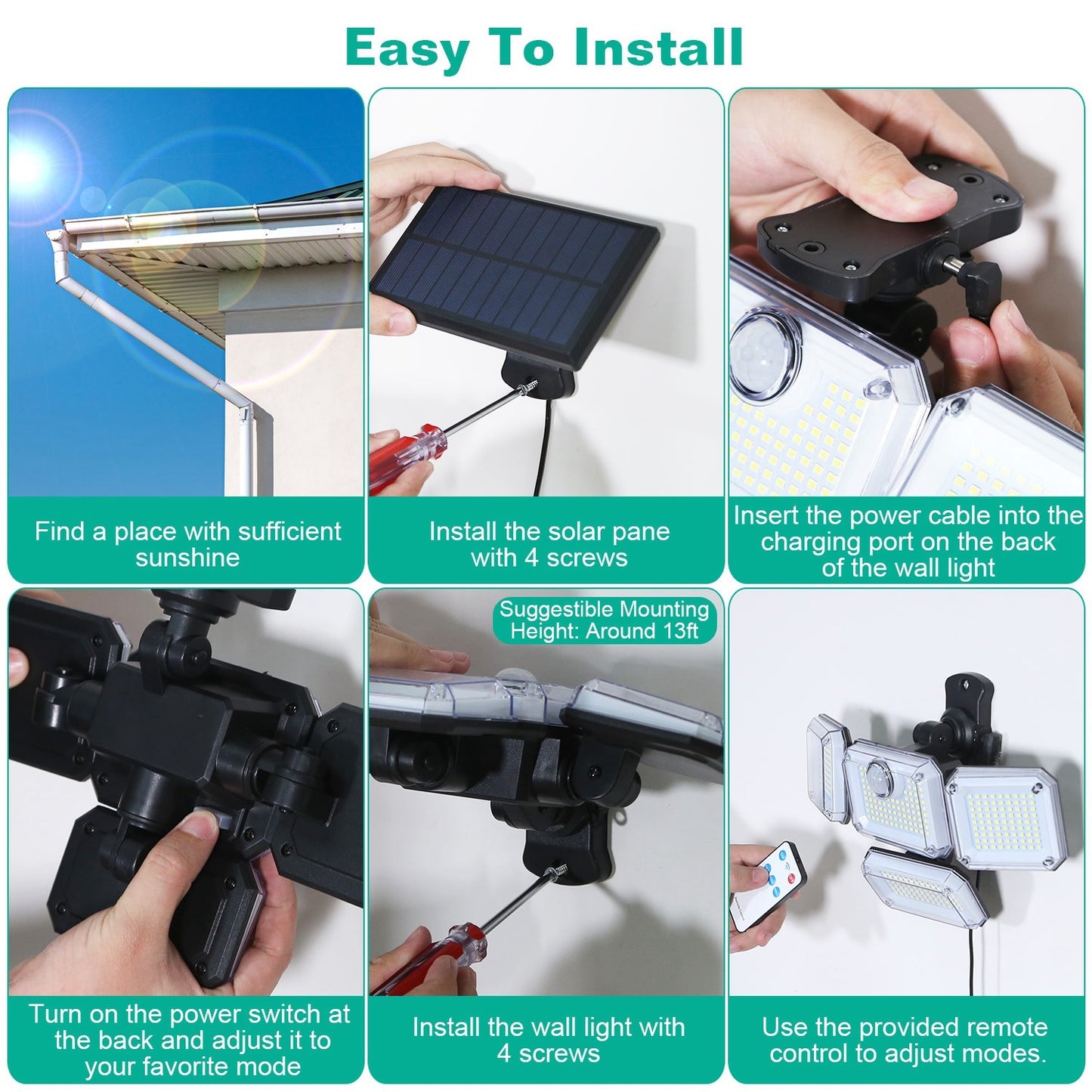 *Easy Installation*:No annoying wires or adapters needed,the installation is super easy. Just simply find a place with sufficient sunshine and fix the light with supplied screws onto it. The ideal installation height is about 13ft.