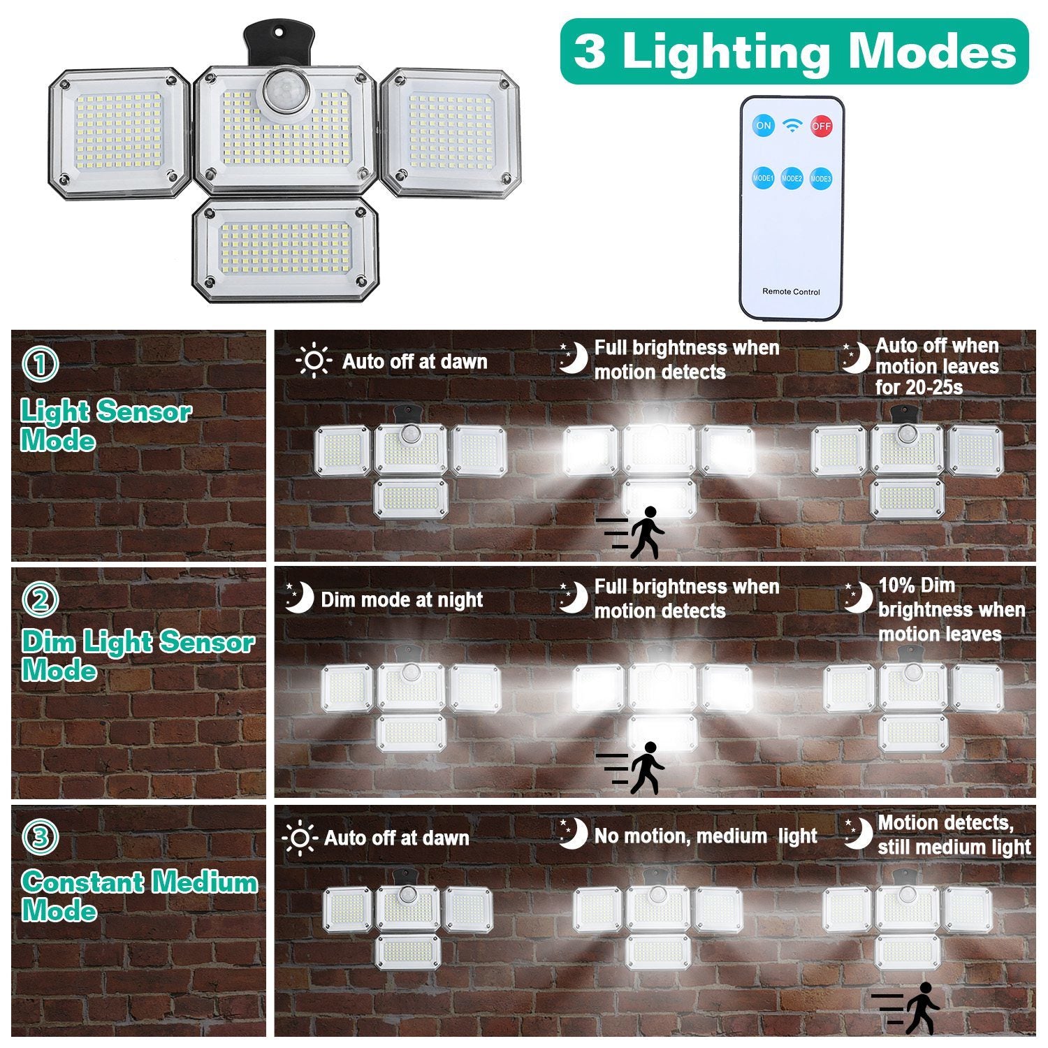 *3 Lighting Modes*:Comes with a wireless remote control,allowing you to select the most appropriate mode more conveniently. No longer need to take it off and set it like other solar light. All you need to do is to manually press the switch for the first time.